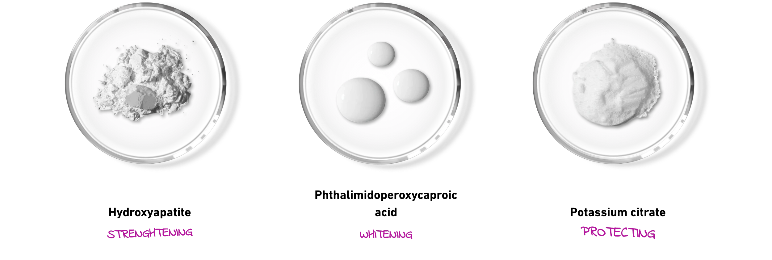 Glycerin, aqua/water, phthalimidoperoxycaproic acid (PAP), potassium citrate, acryloyidimethyltaurate ammonium/VP copolymer, hydroxyapatite, PVP, sodium phosphate, peppermint oil, sodium hydrogen phosphate, sodium hydroxide, sodium salt of calcium butyl alcohol, PVM/MA copolymer, xanthan gum, C12-15 Pareth-3, monosodium citrate, titanium dioxide (Cl 77891), mica (CI 77019), tin oxide (CI 77861).