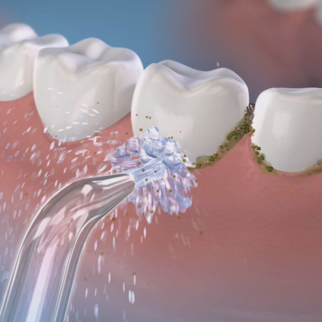 Urządzenie wykorzystuje naprzemiennie silny i delikatny pulsujący strumień wody, aby dokładnie dbać o dziąsła i masować je, a także dokładnie czyścić przestrzenie międzyzębowe.